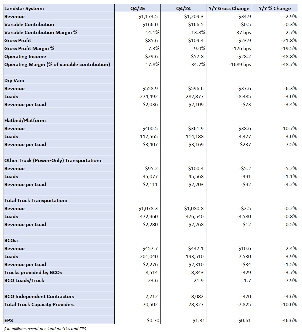 Landstar noted modest softness in consumer durables revenue (down 2% y/y) along with continued weakness in the automotive (down 7%) and construction (down 3%) verticals. Flatbed demand benefitted from the build out of data centers and decent energy-related revenue (up 6%).
